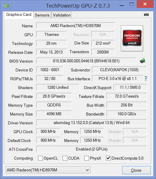 Unser X7 Testgerät wird von zwei Radeon HD 8970M GPUs in einem CrossFireX-Verbund befeuert (Bios 015.036.000.005 und Treiberversion 13.152.0.0). Da es sich um die zurzeit schnellste Lösung von AMD handelt, sind die synthetischen Benchmarkergebnisse entsprechend hoch. Eurocom bietet eine Vielzahl von Grafikkarten an - auch von Nvidia - falls der Anwender die GTX 7xxM Kepler-Architektur AMD's GCN-Modellen vorzieht. Zudem sind auch Quadro GPUs (K1000M bis K5000M) für Workstation-Anwender verfügbar.