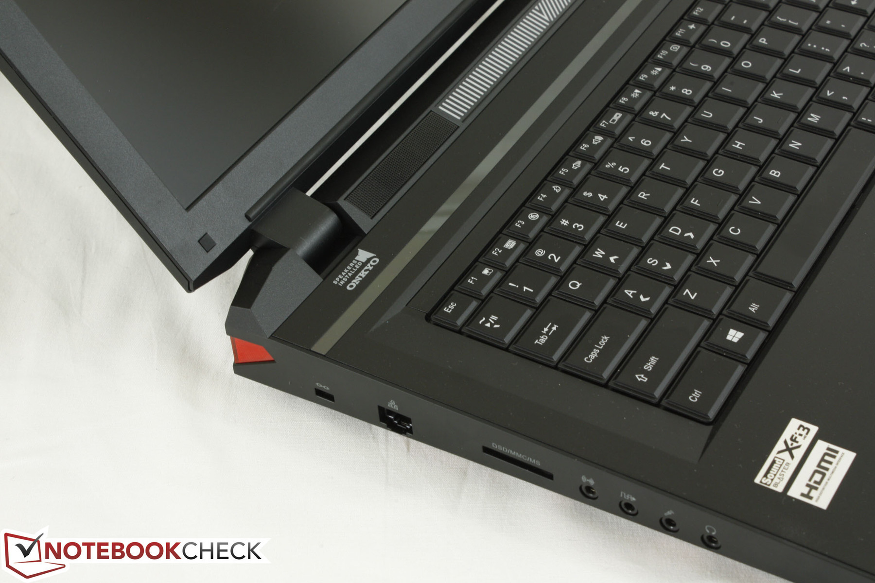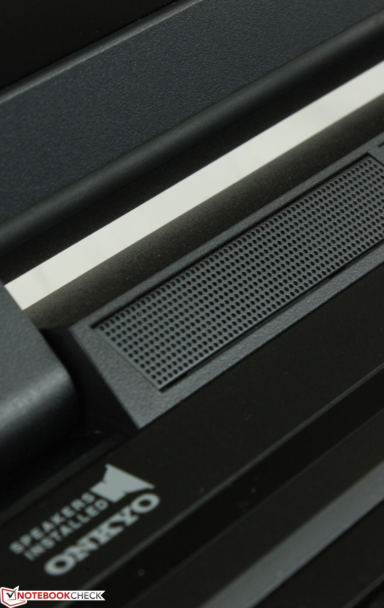 Zwei 2,2 Watt Lautsprecher von Onkyo und ein 2,5 Watt Subwoofer auf der Unterseite des Notebooks kümmern sich um den Klang. Wie auch schon beim P370SM kommt die Sound Blaster X-Fi MB3 Software zum Einsatz. Die blaue Lichtleiste zwischen den beiden Lautsprechern pulsiert passend zum Klang, was beim Spielen ein durchaus hilfreicher Indikator für sich annähernde Gegner sein kann. Bei normaler Musik oder Filmen kann es aber schnell zu aufdringlich sein, daher lässt sich das Feature glücklicherweise auch deaktivieren.