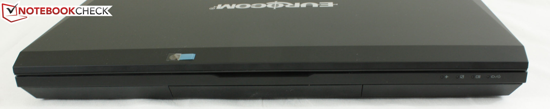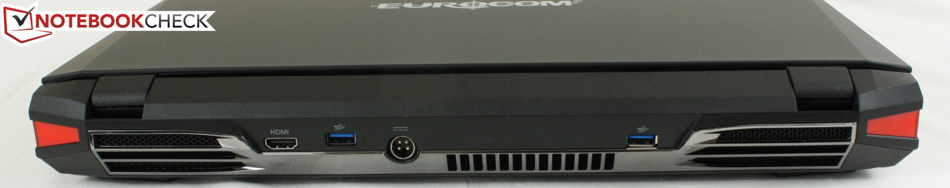 Clevo Gehäuse waren schon immer einfach zu erkennen. Mattschwarzes Finish, eckiges Profil sowie scharfe Ecken und Kanten sind typisch für die Gehäuse des taiwanesischen Herstellers. Diese Eigenschaften gelten auch für das EUROCOM X7, allerdings gibt es zusätzlich noch einige extra Elemente um das Gerät attraktiver zu gestalten: Chromeinfassungen für die hinteren Luftauslässe und Anschlüsse, sowie rote LEDs an den Ecken, die leuchten wenn das Netzteil angeschlossen ist. Die blauen Lichter am Displayrand sind weitere visuelle Ergänzungen, die zudem als eine Art Equalizer fungieren, während das Emblem auf dem Touchpad ein Überbleibsel vom X3 ist. Die Implementierung dieser LED-Elemente ist sehr wahrscheinlich auch von anderen DTRs oder sogar High-End-Desktops beeinflusst worden, wo Spieler diese Art von Beleuchtung erwarten. Obwohl einige Anwender die Beleuchtung übertrieben finden werden, ist es im Vergleich mit den alten Clevo Gehäusen optisch sicherlich attraktiver.
