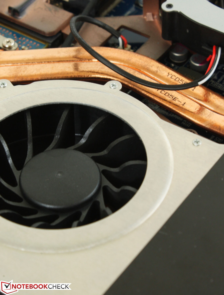 Das Notebook besitzt insgesamt drei Lüfter: Einen für den Prozessor und zwei für die Grafikkarten. Alle drei Lüfter haben ihren eigenen Luftauslass auf der Rückseite des Gerätes und Kühlkörper aus Kupfer. Obwohl beide Grafikkarten identisch sind, unterscheidet sich die Größe der beiden zugehörigen Lüfter. Der kleinste Lüfter in Bezug auf den Durchmesser ist der 50 mm Prozessorlüfter, während beide Grafikkartenlüfter jeweils einen Durchmesser von 60 mm haben. Allerdings ist der GPU Lüfter neben dem Prozessor deutlich dicker als die anderen beiden.