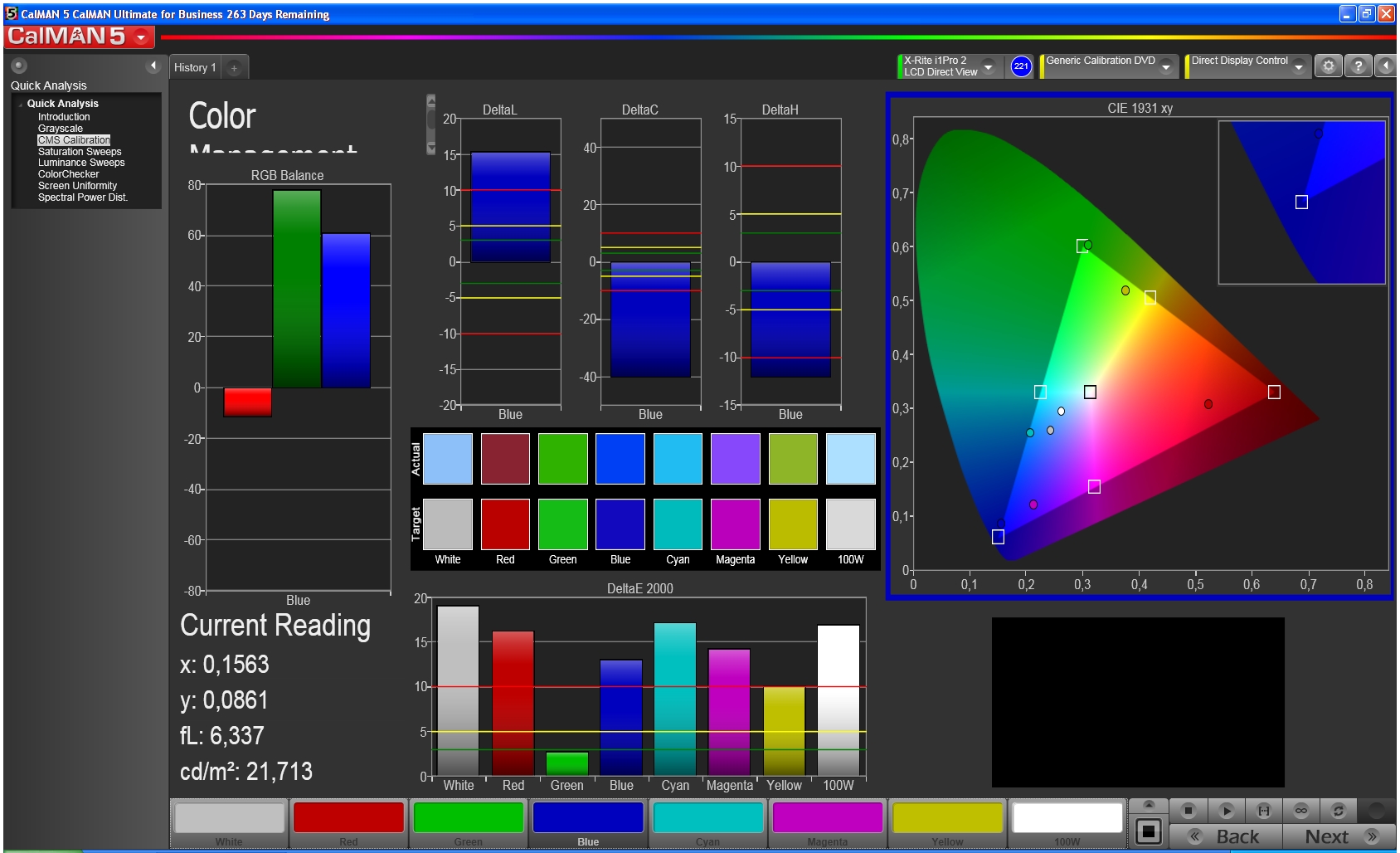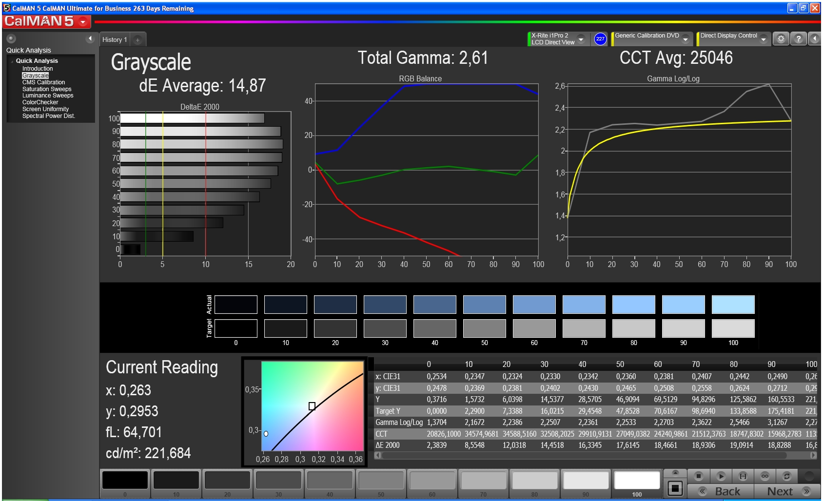Subjektiv fällt die Bildqualität nur durchschnittlich aus. Es fehlt den Farben an Brillanz. Schwarz wird nicht satt, sondern dunkelgrau dargestellt, und der schwache Kontrast kostet einfach Dynamik. Mit dem Colorimeter X-Rite i1Pro 2 und der Software Calman bewerten wir zusätzlich die Wiedergabe von Graustufen und Farbtönen für RGB (Rot, Grün, Blau) und CMY (Cyan, Magenta, Yellow). Und die Ergebnisse sind geradezu bestürzend. Schon bei den Graustufen ermittelt das Messgerät erhebliche Abweichungen, die von dunklen zu hellen Bereichen hin zunehmen. Die Farben liegen ebenso weit entfernt vom Optimum. Nur im grünen Bereich trifft das Tablet die sRGB-Vorgabe recht gut. Bei geringer Farbsättigung tritt zudem ein starker Blaustich zutage. Auch die RGB-Balance ist völlig aus den Fugen geraten.
