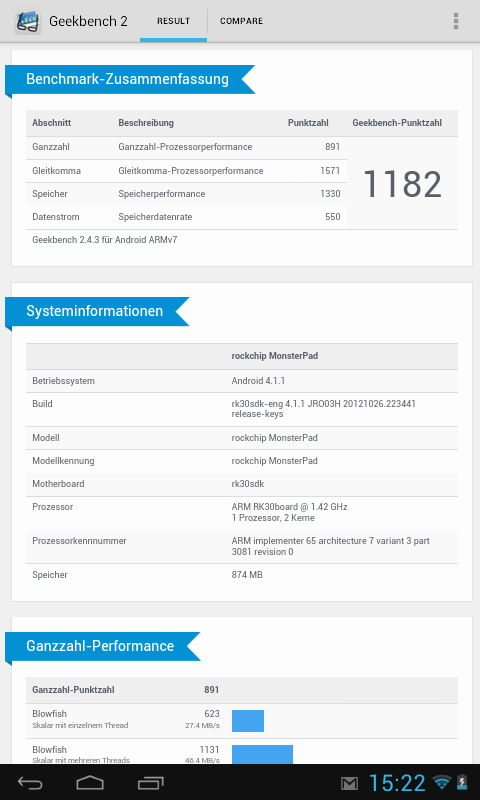 Eine Dualcore-CPU mit 1,4 GHz Arbeitstakt nebst 1 GB Arbeitsspeicher sollte für die täglichen Aufgaben vollkommen ausreichen. Der Hersteller nennt einen Takt von 1,6 GHz. Das zweifeln wir jedoch an. Zwar identifizieren die Benchmarks und einschlägigen Tools den Prozessor eindeutig als den im Datenblatt angegebenen Rockchip RK3066. Als maximale Taktfrequenz allerdings geben mehrere Apps übereinstimmend nur 1416 MHz aus. Entscheidend ist dennoch letztlich die gebotene Leistung, die wir in mehreren Kategorien überprüfen. Den Anfang macht die Gesamtperformance des Systems. Hier schneidet das MonsterPad innerhalb der Vergleichsgruppe am besten ab und distanziert auch die Budget-Tablets von Acer und Asus. Das Braun B-Tab taugt hingegen kaum als Sparringspartner.