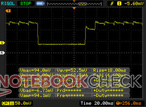 Ein ähnliches helligkeitsabhängiges PWM-Verhalten wie beim XPS 15 7590 OLED und dem Razer Blade 15 OLED konnten wir auch beim Nightsky RX15 OLED feststellen. Bei einer Helligkeit von 49 Prozent und mehr liegt die Frequenz zwar noch konstant bei 59,52 Hz, bei Helligkeitsstufen von 48 Prozent und weniger erhöht sie sich jedoch schlagartig auf 235,8 Hz. Dieses Verhalten zeigt sich bei Laptops mit IPS-Panels nicht.