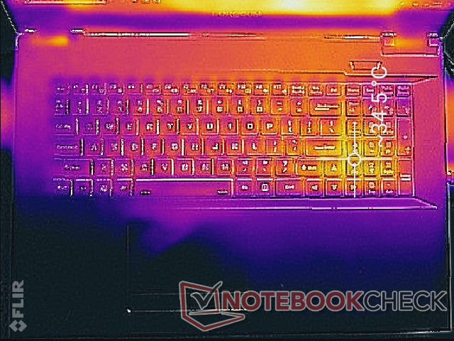 Im Gaming-Betrieb kann ein Großteil der Tastatur bis zu 45 °C erreichen, während die Temperatur der Handballenauflagen und das Touchpad fast unverändert bleiben. Die WASD-Tasten werden dabei zwar wärmer, jedoch nicht genug, um vom Spielen abzulenken. Die übrigen Tasten kommen nicht so glimpflich davon; da die Ziffernblock- und Enter-Tasten unter hoher Systemlast zwischen 40 und 45 °C erreichen können, sollte man dabei vermutlich davon absehen, lange Aufsätze oder Tabellen zu erstellen. Vergleichsweise erreichen die Tasten des Lenovo Legion Y740 und des Razer Blade Pro 17 unter der gleichen Gaminglast jeweils nur ca. 36 bis 38 °C.