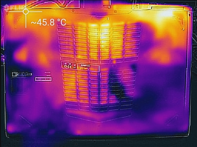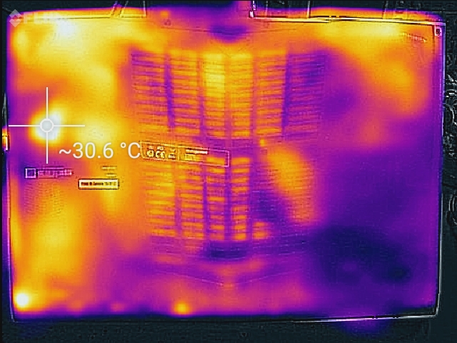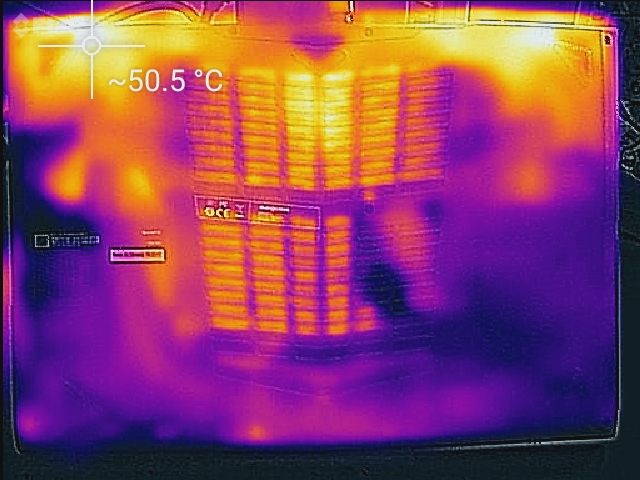 Das Notebook geht auch gut mit Oberflächentemperaturen um: Die durchschnittlichen Temperaturen liegen bei 38,5 °C (oben) und 39 °C (unten). Wir fanden zwei Hotspots von 48,2 °C und 51,4 °C, welche sich an der Unterseite, neben den beiden Lüftungsschlitzen befinden, was uns daher nicht überrascht. Da das Gerät unter so starker Last auf einer harten Fläche aufliegen sollte, macht uns das nicht allzu große Sorgen. Uns interessiert mehr, wie die Hitzeverteilung auf der Oberseite der Basiseinheit aussieht. Zum Glück fühlt sich das Gerät hier höchstens warm an, obwohl wir anmerken möchten, dass die rechte Seite der Handballenauflage unter Last deutlich mehr aufheizt als die linke Seite (etwa 5 °C Unterschied). Das liegt daran, dass die NVMe-SSD unter der rechten Handballenauflage liegt. Entscheidet man sich für eine Lösung mit zwei SSDs, wird der Hitzeunterschied zwischen den beiden Seiten wohl noch größer. Da das auf die Dauer schon etwas störend ist, hätten wir uns gefreut, wenn hier ein Kupfer-Kühlkörper oder Ähnliches eingebaut worden wäre.