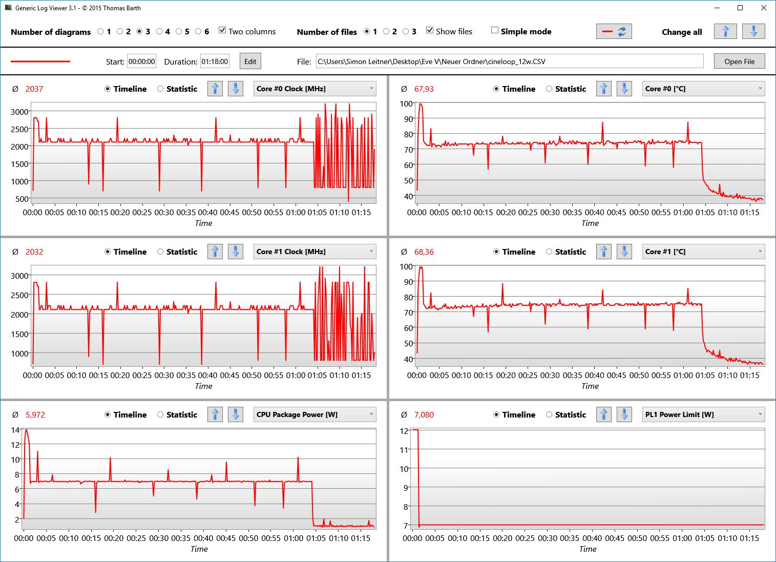 Kommen wir zu den Leistungsreserven des Eve V: Die Wahl für dieses Projekt fiel auf Prozessoren der Y-Serie von Intel. Dabei handelt es sich um passive gekühlte Chips mit einer TDP von 4,5 Watt. Auch wenn die i5-7300U im Surface Pro kurzzeitig deutlich höhere Leistung abrufen kann, pendelt sich diese bei länger andauernder Last auf dem Niveau der u.a. hier vorliegenden i5-7Y54-Version ein. Alle von uns getesteten Chipvarianten (m3, i5, i7) zeigten unter Dauerlast eine annähernd stabile Leistungsentwicklung. Seltsam war allerdings, dass die uns vorliegende m3-Version in vielen Tests erheblich besser abgeschnitten hat, als die wesentlich kostspieligeren i5- und i7-Versionen. Für Office-Basics ist das Eve V ein gut geeignetes Gerät, auch aufgrund der guten Akkulaufzeit die erreicht werden kann. Für Content-Ersteller könnte sich insbesondere die CPU des Gerätes bei komplexer Software schnell als Engpass abzeichnen.