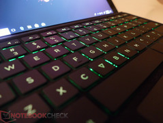 Die Tastatur des Eve V soll auch im nicht angedockten Zustand verwendbar sein. Die Kommunikation mit der Tableteinheit basiert hier auf Bluetooth 4.2, demzufolge müssen die Geräte zuvor gepairt werden. Gefallen finden wir auch an der Hintergrundbeleuchtung der Tastatur, die zwischen 7 Farben umgeschaltet werden kann ("Fn+V"). Die Beleuchtung selbst ist zweistufig bzw. kann natürlich auch ausgeschalten werden.