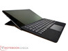 Das Keyboard-Dock gehört mit einer Dicke von rund 7 Millimetern eher zu den wuchtigeren seiner Art und wird per Magneten am Tablet fixiert. Die Arretierung erfolgt praktisch von alleine, sobald die Magneten nahe genug aneinander herangebracht werden. Durch eine zusätzlich Nut im hinteren Bereich der Tastatur kann diese wahlweise flach auf dem Tisch, oder in einem leichten Winkel fixiert werden. Ober- und Unterseite der Tastatur sind in Alcantara ausgeführt und weisen die typische weiche raulederartige Haptik auf. An den umlaufenden Kanten sorgt eine Kunststoffleiste für zusätzlichen Schutz. Out of the Box fühlt sich das Keyboard mit seiner textilen Oberfläche nicht nur großartig an, es sieht zudem auch gut aus. Wie sich dies nach 1-2 Jahren täglichen Einsatzes verhält, darüber darf spekuliert werden. Speziell die Bereiche in den Tastenzwischenräumen sind sehr schwer zu reinigen und werden wohl über den Nutzungszeitraum hinweg in Mitleidenschaft gezogen werden.