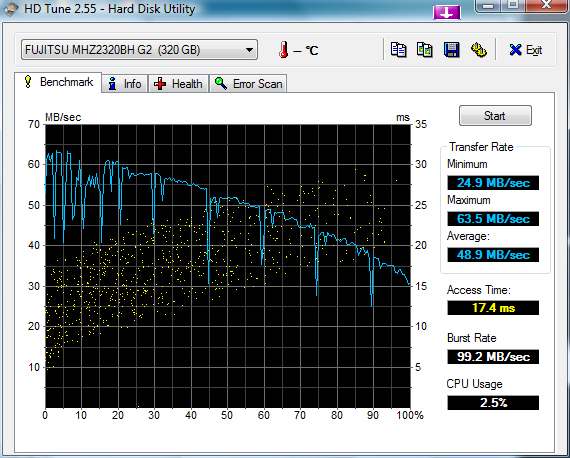 Die in unserem Testsample eingesetzte Festplatte mit 320GB Bruttokapazität stammte ebenso aus dem Hause FSC (MHZ2320BH). Im HDTune Bechmarktest zeigte diese mit 48.9 MB/sec passable durchschnittliche Übertragungsraten und mit einer Zugriffszeit von 17.4 Millisekunden auch in dieser Disziplin ein vertretbares Ergebnis.