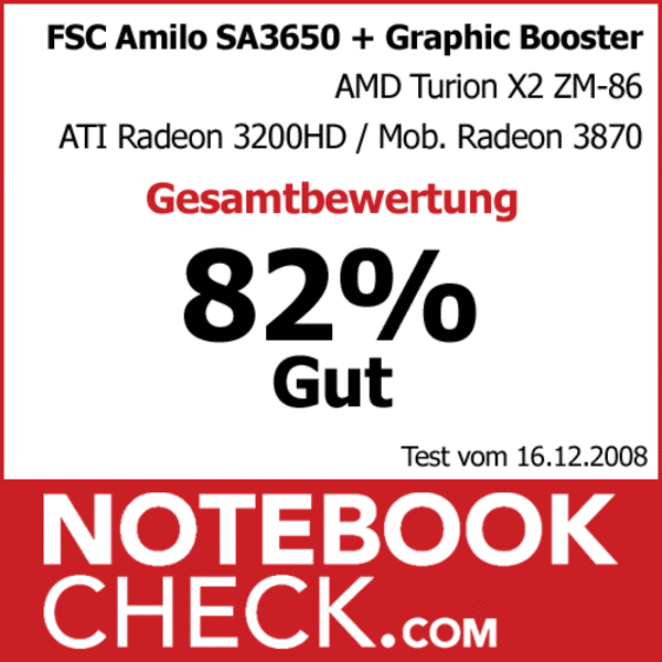 Die Bewertung des Amilo Sa3650 Notebooks gestaltet sich überaus kompliziert. Einersteits zeigt das 13.3 Zoll Gerät in seiner Klasse als Subnotebook teils deutliche Schwächen die auf die Bewertung drücken. Andererseits ermöglicht der Graphic Booster eine DTR-nahe Leistung bei Games. Je nach Zuordnung erreicht das SA3650 damit zwischen 80 und 82%. Für den Graphic Booster gibt es außerdem eine gesonderte Auszeichnung, hat FSC damit letztlich das überaus erfolgreich realisiert, woran sich andere Hersteller bereits die Zähne ausgebissen haben.