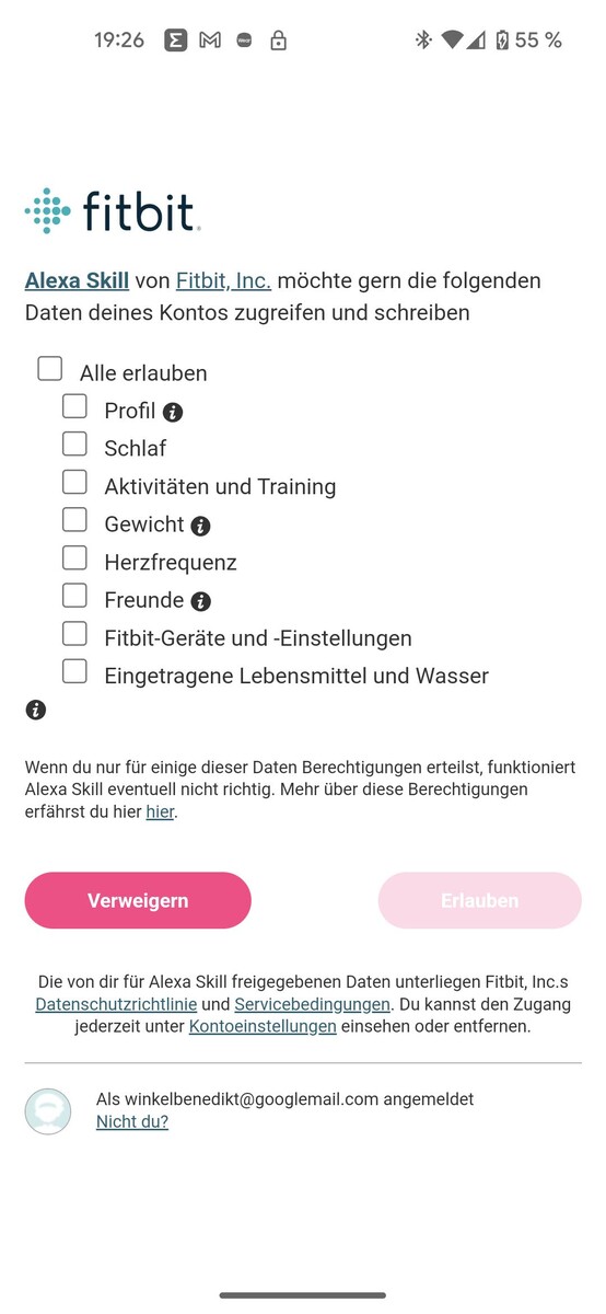 Obwohl Fitbit mittlerweile zu Google bzw. Alphabet gehört, setzt der Hersteller beim Sprachassistenten auf Alexa von Amazon. Ein Amazon-Konto muss in der Fitbit-App hinterlegt werden, dann ist eine Zugriff auf den Sprachassistenten möglich.