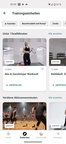Die Fitbit-App ist in fünf Kategorien unterteilt: Heute, Entdecken, Community, Premium und Konto. Die ersten vier Bereiche sind am unteren Rand des Displays leicht zu finden. Hinter "Entdecken" sind nicht nur Trainings- und Achtsamkeitsübungen aufgelistet, sondern auch Statistiken und - etwas versteckt - Apps und Ziffernblätter. Käufer der Sense 2 bekommen die Premium-Variante für sechs Monate gratis, danach ist ein Abo fällig. Die Zusatzfunktionen beinhalten etwa einen Tagesform-Index, eine erweiterte Schlafananlyse, einen Gesundheitsbericht, Achtsamkeitsübungen, Video-Workouts und besondere Ziffernblätter.
