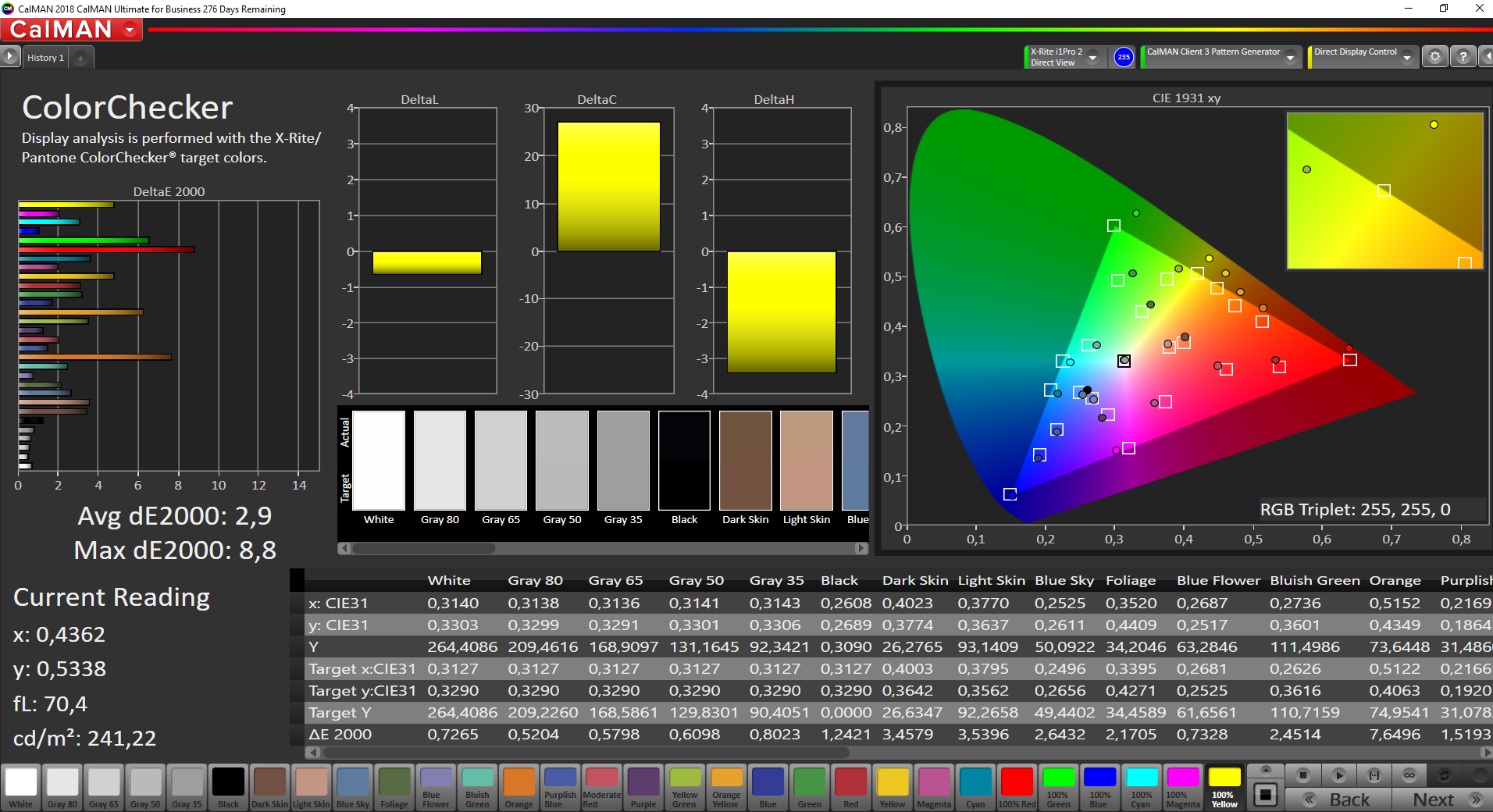 | Colorchecker dE 2000 calibrated * | 2.9 | 2.4 17% | 3.13 -8% | 4.6 -59% | |