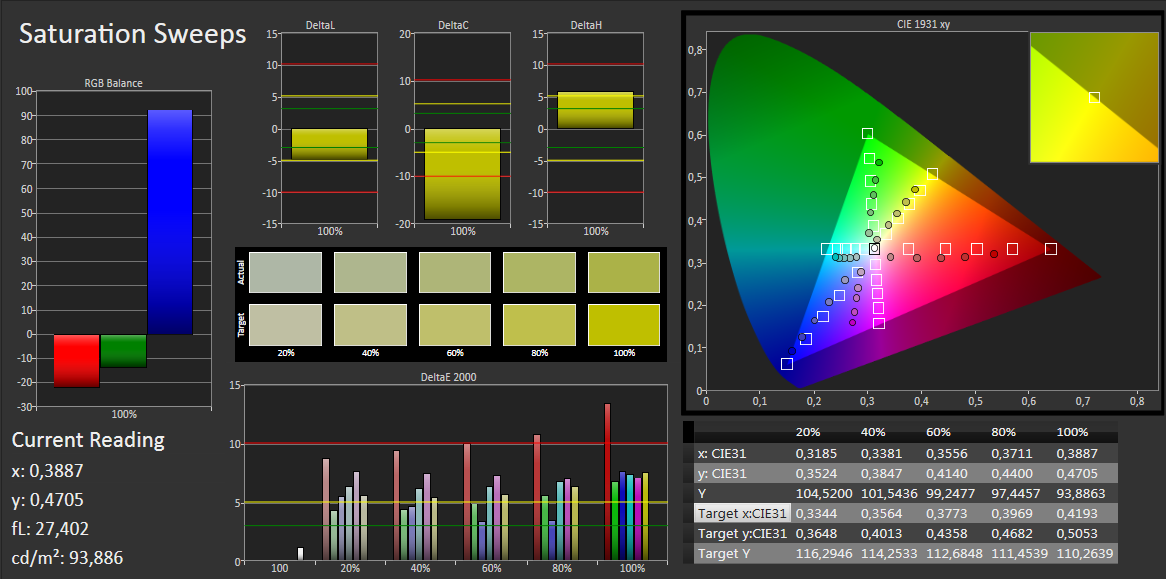 Auch unser Blick auf die Farbdarstellung kann das Ruder für das gewählte Panel nicht mehr herumreißen. Ein DeltaE(2000) von 6,77 im Colorchecker und 6,82 bei den Graustufen weist auf eine sichtbare Abweichung im Vergleich zum sRGB-Soll hin. Auch wenn dies eher nur für Grafiker von Interesse ist, hat auch der Otto-Normal-Verbraucher einen sichtbaren Blaustich des Bildes zu akzeptieren.