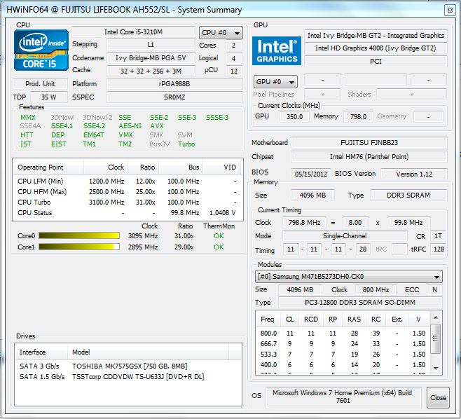 Fujitsu rüstet das AH552/SL mit einem Zweikernprozessor der Firma Intel aus. Es handelt sich um den Intel Core i5-3210M Prozessor. Der Zweikerner entstammt Intels-Ivy-Bridge-Prozessorgeneration. Die Arbeitsgeschwindigkeit der CPU liegt bei 2,5 GHz. Die Geschwindigkeit kann auf 2,9 GHz für alle zwei Kerne und 3,1 GHz für einen Kern erhöht werden. Die dahinterstehende Technik trägt die Bezeichnung Intel Turbo Boost. Die Beschleunigung der CPU-Kerne verläuft automatisch.