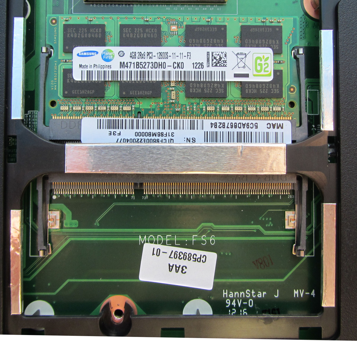 Trotz des schlanken Gehäuses hat Fujitsu die Wartungsmöglichkeiten nicht vernachlässigt. Auf der Unterseite des Notebooks finden sich zwei Wartungsklappen. Die kleine Klappe deckt den Festplattenschacht ab. Die Festplatte ließe sich problemlos ausbauen und gegen ein anderes Modell ersetzen. Die große Klappe gibt den Zugriff auf den Arbeitspeicher und den Kühlkörper frei. Das Lifebook AH552/SL besitzt zwei Arbeitsspeicherbänke. Beide Bänke können Module aufnehmen, die eine Speicherkapazität bis zu 8 Gigabyte besitzen. Somit unterstützt das Gerät insgesamt bis zu 16 Gigabyte Arbeitsspeicher. Unser Testgerät ist mit einem Vier-Gigabyte-Modul bestückt. Eine Aufrüstung auf 8 Gigabyte wäre schnell und einfach zu machen. Die Preise für ein Vier-Gigabyte-Modul liegen aktuell bei etwa 20-25 Euro. Der Nutzer hat zudem vollen Zugriff auf den Kühlkörper und den Ventilator. Einer regelmäßigen Reinigung steht also nichts entgegen. Auch ließe sich der Prozessor austauschen. Den Akku des Notebooks findet man hinter den Wartungsklappen nicht. Um diesen zu erreichen, müsste das Notebook weitergehend demontiert werden.