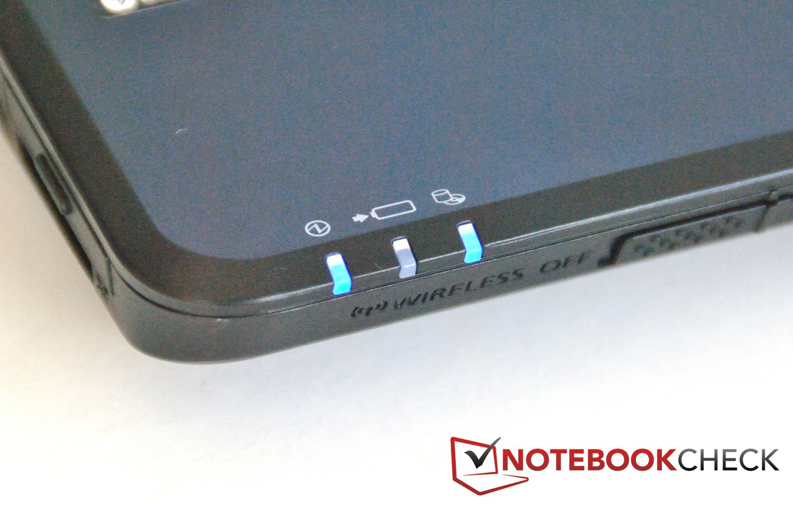 Die Enttäuschung folgt, wenn man das Subnotebook aufklappt: Innen muss sich der Benutzer mit Hochglanzflächen um das Display und die Tastatur herum abfinden. Diese verschmutzen schnell und müssen daher häufig gereinigt werden. Abgesehen davon sieht das glänzende Plastik sehr billig und unpassend aus. Der Startknopf ist recht groß und wird blau beleuchtet. In der gleichen Farbe leuchten die drei Status-LEDs vorne links.