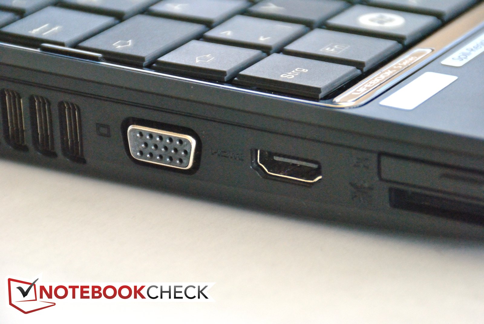 Das Lifebook ist für seine Preisklasse recht gut ausgestattet. Auch wenn USB 3.0 fehlt, können Daten zügig über die eSATA-Schnittstelle kopiert werden. Diese wurde mit einer USB 2.0-Buchse kombiniert. Zwei weitere USB 2.0-Anschlüsse findet man auf der rechten und linken Seite hinten. Ebenfalls an Bord ist der standardmäßige Ethernet- und VGA-Anschluss. HDMI befindet sich links vorne neben dem 4-in-1 Kartenleser (SD/MMC/MS/MS-PRO). Darüber befindet sich sogar noch ein ExpressCard 34 mm. Vorne kann man Kopfhörer oder ein Mikrophon/Line-In anschließen.