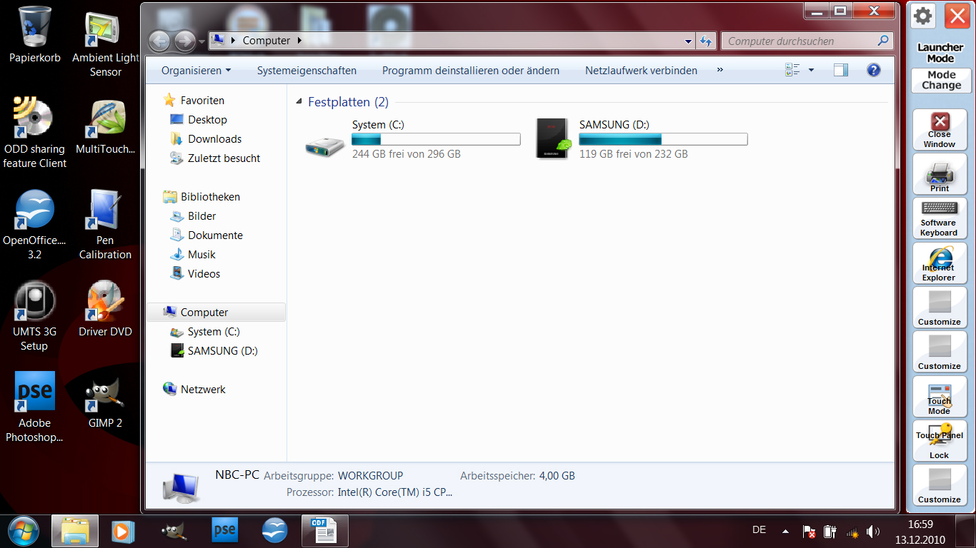 Die Fingerbedienung leidet etwas unter der hohen Auflösung. Buttons, Menüs und Schaltflächen sind für die dicken Fingerspitzen oftmals einfach zu klein. Zwar hat Fujitsu mit angepassten (vergrößerten) Icons im Touchmodus etwas Besserung herbeiführen können, insgesamt stößt man jedoch oft auf zu kleine Bedienfelder, die mit dickem Finger schon mal Fehleingaben hervorrufen. Deutlich effektiver funktioniert hier die im System vorgesehene Anpassungsmöglichkeit der Darstellungsgröße von Schriften und Symbolen, die bei 125% ein angenehmes Arbeiten ermöglicht. Ordner, Dateien usw. lassen sich dann gut verschieben oder bearbeiten.