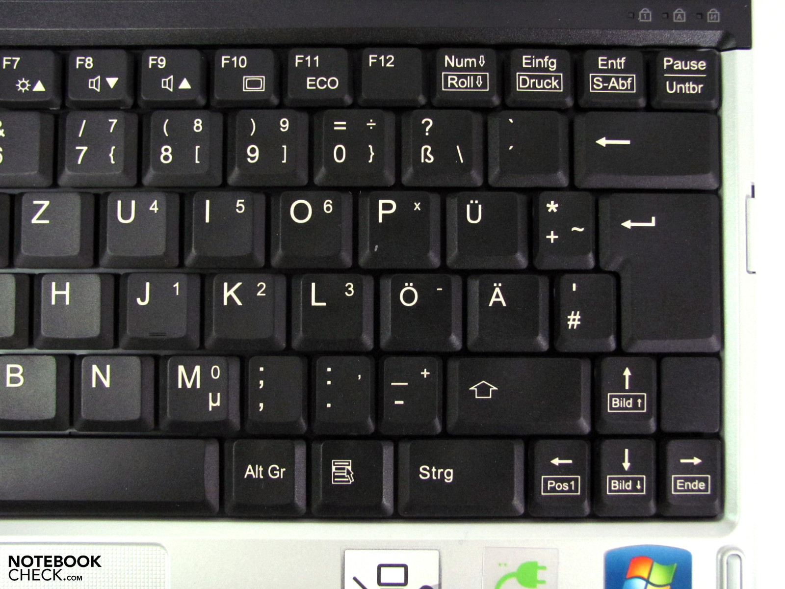 Die Tastatur ist insgesamt sehr stabil ausgeführt und lässt sich nur am linken Rand ein kaum wahrnehmbares Klappern und Nachfedern entlocken. Ansonsten liegt die Eingabe sehr fest auf und gibt ein angenehmes Feedback. Die Tasten sind im 17,5 mm Raster ausgeführt, lassen sich aber nach kurzer Eingewöhnung auch dank des Standardlayouts sicher bedienen. Der mittelkurze Hub wird von einem klaren Druckpunkt begleitet und das Anschlagsgeräusch bleibt stets dezent im Hintergrund. Die kontraststarke Beschriftung sorgt auch bei dunkleren Lichtverhältnissen lange für gute Erkennbarkeit. Eine Tastaturbeleuchtung fehlt aber. Sonderfunktionen sind per FN-Kombinationen in üblicher Anzahl integriert worden, für den Tablet-Modus relevante Sondertasten sind im abstehenden Wulst untergebracht.