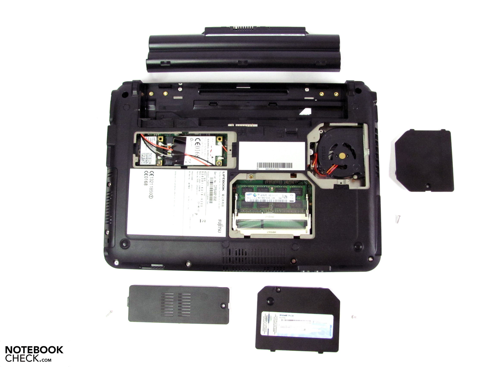 Die Stabilität des Gehäuses ist als überdurchschnittlich einzustufen. Die Handballenablage und sonstige Gehäuseteile lassen sich, wenn überhaupt, nur minimal eindrücken oder verwinden. Auch der Bildschirmrahmen profitiert von der dicken Materialstärke und lässt sich nur mit starkem Zug und Gegenzug an entgegengesetzten Ecken etwas verformen. Bei Druck auf den Rahmen sind keinerlei Bildstörungen zu provozieren. Am Unterboden befinden sich mehrere Öffnungen, über die die wichtigsten Komponenten erreichbar sind. Der mit 2 Schrauben gesicherte Massenspeicher, lässt sich komfortabel an der rechten Gehäuse-Seite herausziehen und dann bei Bedarf austauschen.