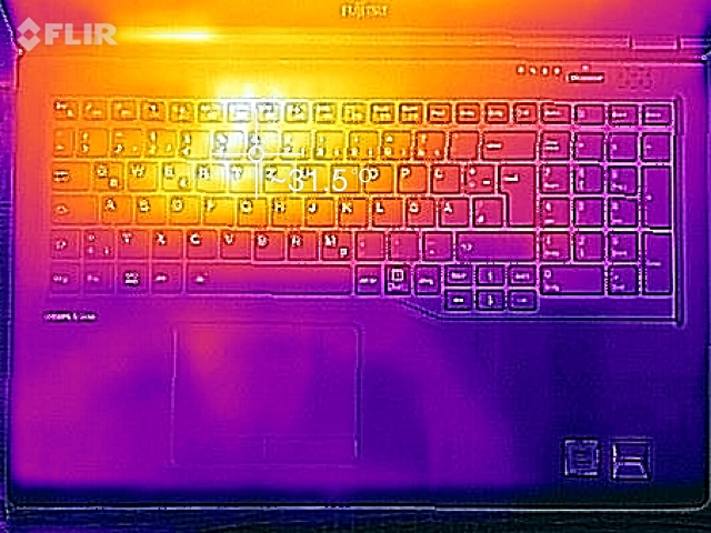 (+) Die Handballen und der Touchpad-Bereich sind mit gemessenen 23.3 °C kühler als die typische Hauttemperatur und fühlen sich dadurch kühl an.