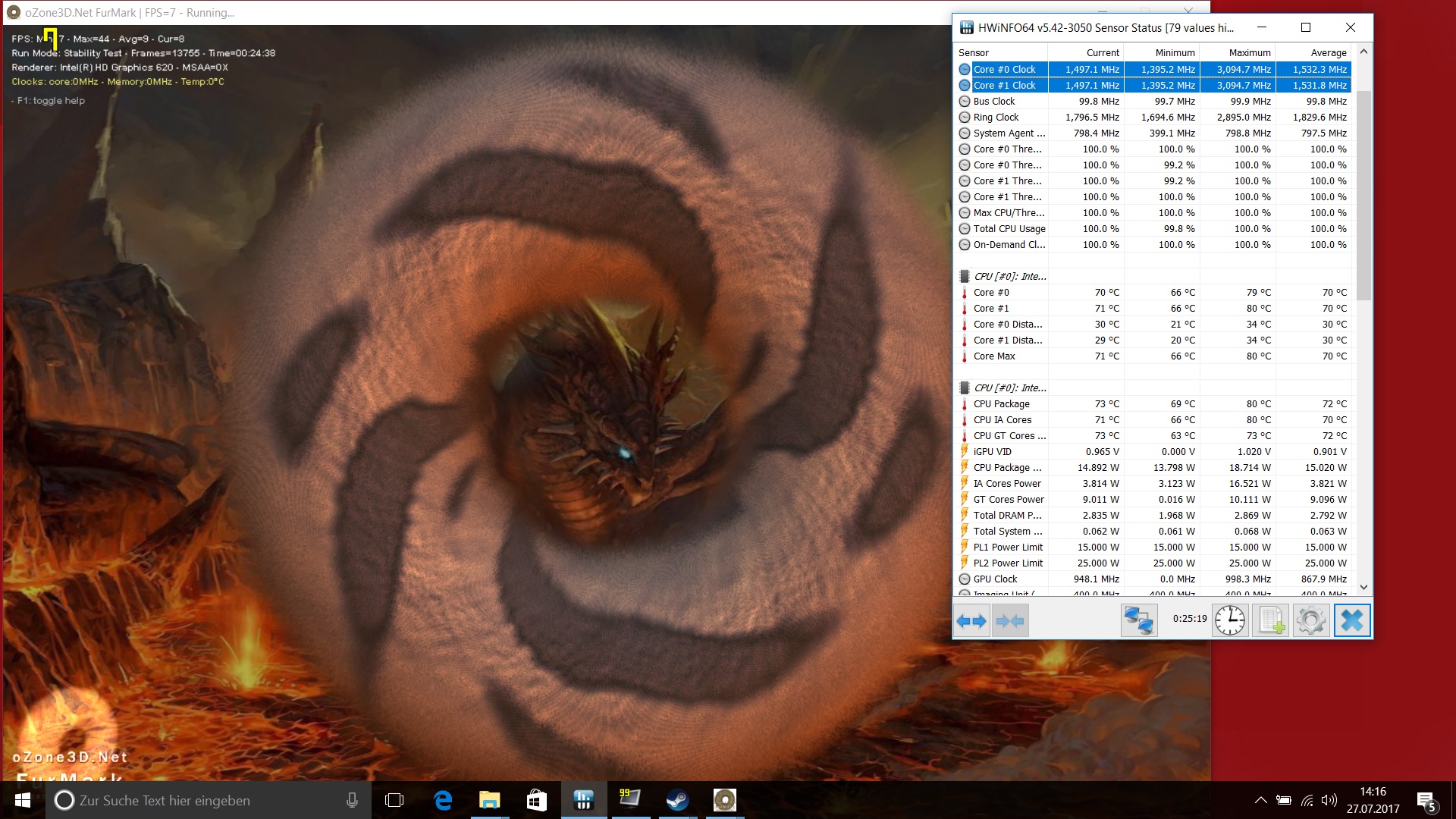Im extremen Stresstest erreicht die CPU zunächst Temperaturen von bis zu 80 °C. Anschließend wird der Takt schrittweise gesenkt, bis die CPU bei 70 - 80 °C gehalten wird. In unserem Test mit Prime95 und Furmark pegelte sich der CPU-Takt auf etwa 1,4 - 1,5 GHz ein. Diese Art des Throttlings ist normal und der gesenkte Takt noch vergleichsweise gut. In der Praxis sind solche Stresslasten für diese Geräteklasse sowieso eher untypisch. Auch nach dem Stresstest laufen die Lüfter noch lange nach, um das Gerät langsam wieder herunterzukühlen.