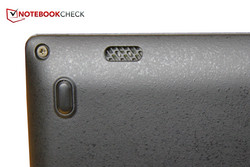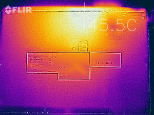 Beim Fujitsu erhitzt sich besonders die rechte Seite zum Bildschirm hin, sodass die Handballenauflagen angenehm kühl bleiben. Unter maximaler Last werden in dieser Zone die 40 °C überschritten. Hier hinten befinden sich auch die kleinen Lüftungsschlitze, durch deren Öffnung die Abwärme nach draußen transportiert wird. Im Vergleich gibt unser Testgerät jedoch das ausgewogenste Temperaturbild ab.