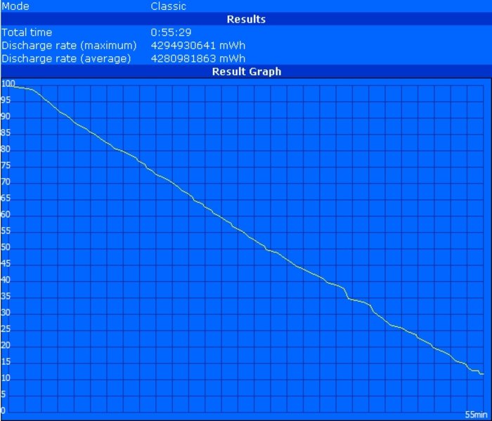 Maximal kann man fast drei Stunden im Akku-Betrieb arbeiten, allerdings bei minimaler Helligkeit und abgeschalteten Wireless-Modulen. Dieser Wert wurde mit dem Reader's Test des BatteryEater Tools ermittelt. Der Classic Test desselben Programms zeichnet für uns bei maximaler Helligkeit und aktivierten WiFi-Geräten eine minimale netzunabhängige Zeit von nur 55 Minuten auf.
