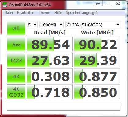Bei der Festplatte handelt es sich um ein Modell aus dem Hause Toshiba. Es ist ein 2,5-Zoll-Modell mit einer (Brutto-) Kapazität von 750 GB und 5.400 U/min. Die Festplatte hat keine besonderen Stärken und kann eigentlich nur durch ihre passable Kapazität punkten. Die Benchmarkergebnisse sind eher mittelmäßig ausgefallen.
