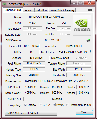 Im Fujitsu Lifebook AH532 kommt die Mittelklassegrafikkarte Nvidia GeForce GT 640M LE zum Einsatz. Die Grafikkarte ist extra für die Benutzung in „thin and light“ (dünn und leicht) Notebooks konzipiert. Dadurch darf man nicht mit übermäßig viel Leistung rechnen, muss dafür aber auch nicht so viel Abwärme abführen. Die im Testgerät verbaute Grafikkarte taktet mit 405 MHz ( Speicher: 900 MHz, Shader: 810MHz). Zum Spielen eignet sich die Grafikkarte nur bedingt. Aktuelle Titel wie Battlefield 3 oder Max Payne 3 lassen sich nur auf mittleren oder minimalen Details flüssig wiedergeben. Weniger anspruchsvolle Spiele wie lassen sich aber auch mit hohen Qualitätseinstellungen flüssig spielen. Dafür ist der Energieverbrauch der Karte nicht übermäßig hoch. Dieser sollte auf Niveau der GT 520M liegen. Durch Absenken des Takts sind noch weitere Einsparungen möglich. Sollte die Leistung der Grafikkarte nicht gebraucht werden, beispielsweise beim Surfen, kann auch komplett auf die im Prozessor integrierte Intel HD Graphics 4000 umgeschaltet werden. Die passiert automatisch per Nvidia Optimus.