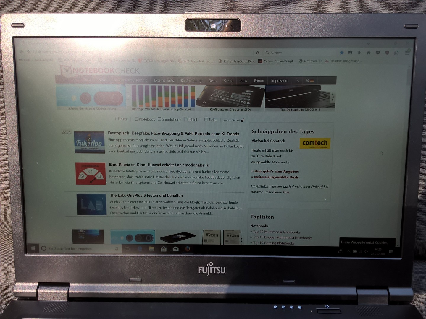 Fujitsu stattet das Lifebook E548 mit einem IPS-Panel aus, das Bildschirminhalte mit einer Auflösung von 1.920 x 1.080 Bildpunkten darstellt. Die Helligkeit des Displays ist nicht besonders hoch, reicht aber aus, um an einem schattigen Plätzchen den Bildschirm lesbar auszuleuchten. Das Kontrastverhältnis ist vergleichsweise niedrig und insgesamt bleibt das Display des Fujitsu Lifebook E548 hinter den meisten Konkurrenzgeräten zurück. Lediglich bei den Reaktionszeiten kann es sich einen der oberen Plätze unserer Vergleichsliste sichern.