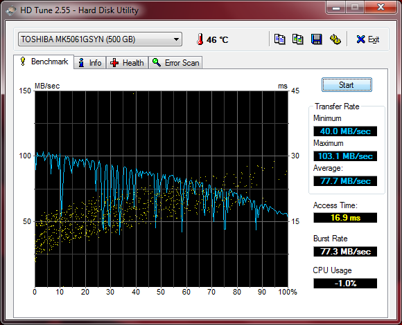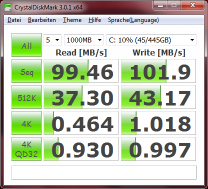 Bei der Leistung reiht sich die Toshiba Festplatte bei ähnlich spezifizierten Modellen der Mitbewerber ein. Als Business-Notebook ist das Lifebook E781 damit ausreichend schnell. An wirklich leistungsfähige Festplatten kommt die Toshiba HDD mit ihrer maximalen Transferrate von knapp über 100 MB/s aber nicht heran. SSDs spielen erst recht in einer anderen Liga. Braucht man unbedingt eine starke Performance des HDD-Subsystems, lässt sich eine SSD im modularen Bay-Schacht nachrüsten.