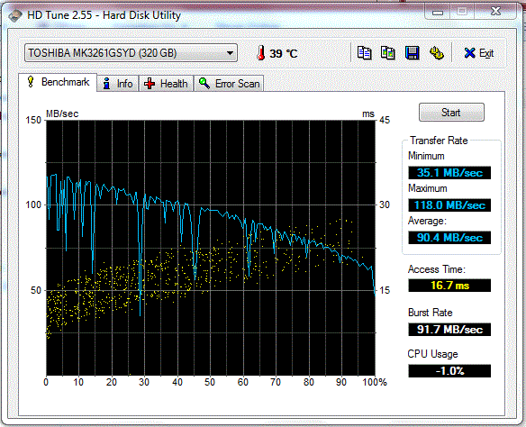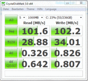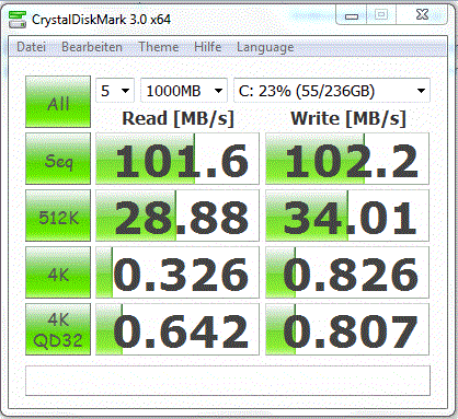 Im Einsatz arbeitet das Subnotebook dann auch etwas behäbig und braucht recht lang für Programmstarts. Der System-Kaltstart dauert 50 Sekunden (vollständig geladen). HD-Tune und Crystal Disk Mark zeigen die typisch mittelmäßigen Durchsätze mit 90 bzw. 102 MB/s beim Lesen. In dieser Hinsicht nehmen sich 5.400er- und 7.200er-HDDs nicht mehr viel. Bei kleinen, verstreuten Dateien müssen sich die Schreib-& Leseköpfe erst auf Position bewegen, weshalb die Durchsätze hier auf 0,3 bis 0,8 MB/s einbrechen. SSDs liegen in dieser Disziplin bei bis zu 20 MB/s (Latitude E6230).