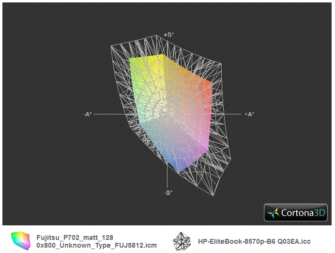 Wir prüfen den darstellbaren Farbraum, welcher etwa für Profi-Grafiker relevant ist. Wir finden, wie erwartet, eine sehr schwache Abdeckung von AdobeRGB (t) und sRGB (t) vor. Zwischen der Anzeige des 12-Zollers und einem Profi-Panel wie im HP EliteBook 8570p (t) liegen hinsichtlich Farbraum (und Kontrast) Welten.