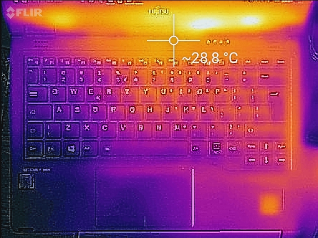 (+) Die Handballen und der Touchpad-Bereich sind mit gemessenen 27.5 °C kühler als die typische Hauttemperatur und fühlen sich dadurch kühl an.