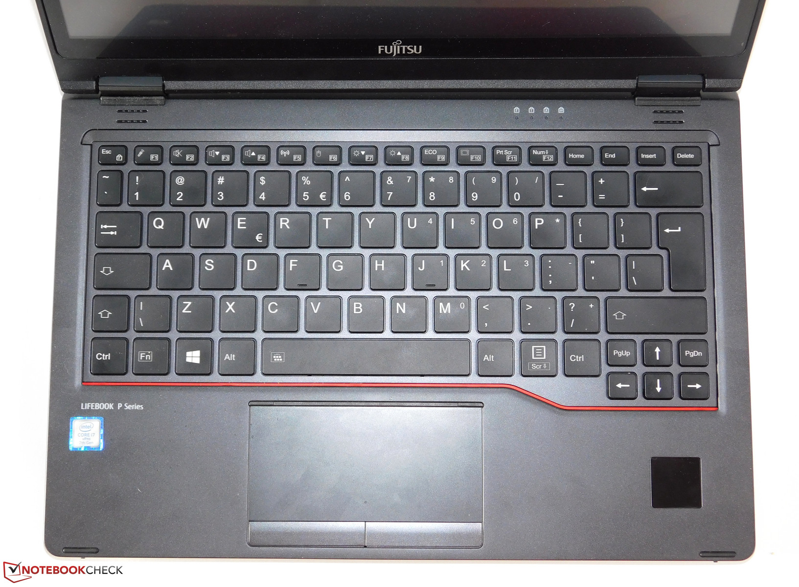 Die Kunststoff-Oberfläche, die Fujitsu für das TouchPad gewählt hat, hilft leider nicht, die Nutzung angenehmer zu gestalten. Im Gegenteil, man hat vielmehr oft das Gefühl, ein wenig hängen zu bleiben. Einen TrackPoint als Alternative verbaut Fujitsu hier nicht, auch nicht optional.