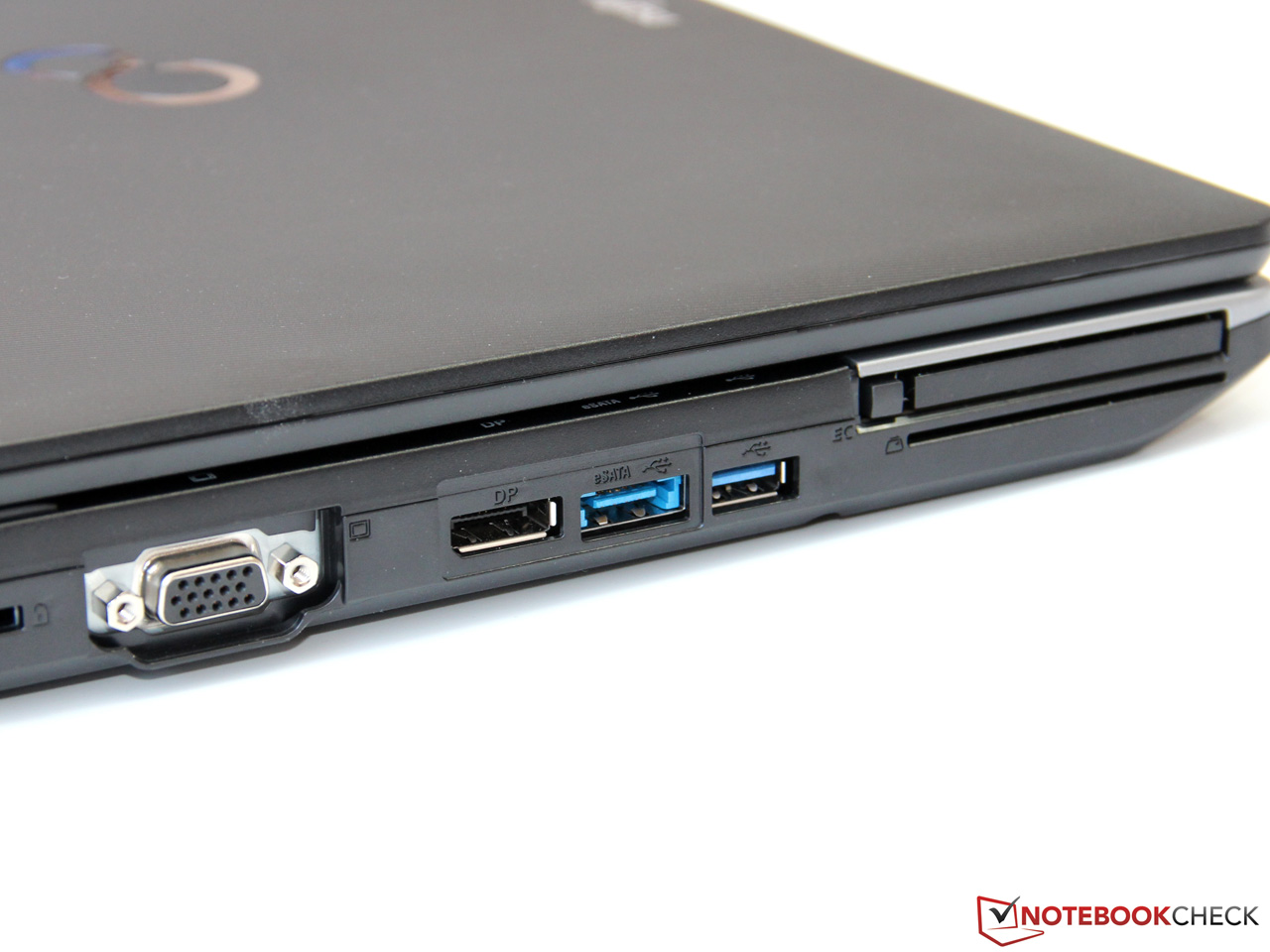 Gegenüber dem Vorgängermodell hat der Hersteller das Anschlussfeld nur minimal überarbeitet. So gibt es weiterhin insgesamt 4 USB-Ports, von denen aber nunmehr zwei den schnellen USB-3.0-Standard beherrschen. Einer der Ports wurde dabei als Kombination mit eSATA ausgeführt, auch wenn diese Schnittstelle mittlerweile weitestgehend von USB abgelöst wurde. Weitere Anschlüsse können sowohl per Docking-Station (ab etwa 100 Euro) als auch ExpressCard (34/54 mm) ergänzt werden. Ebenfalls erwähnenswert ist der in voller Größe ausgeführte DisplayPort-Ausgang – viele aktuelle Notebooks bieten nur eine Mini-Buchse, die spezielle Kabel oder Adapter erfordert.