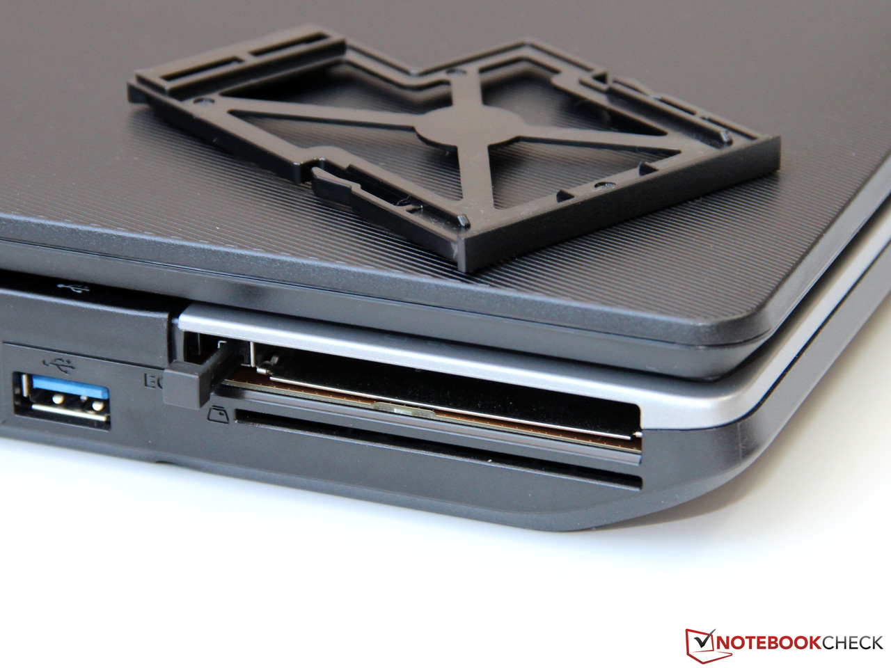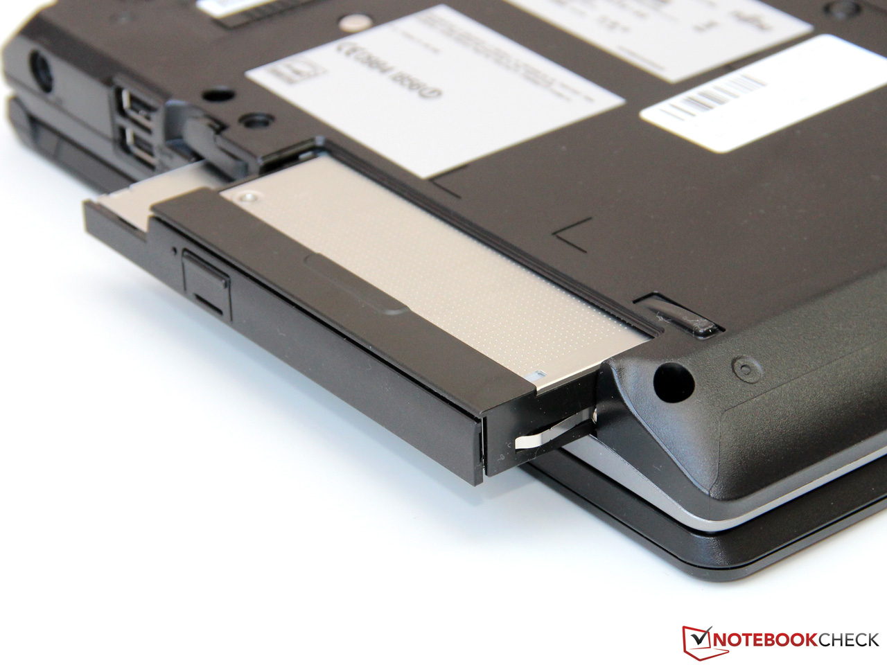Besonders leicht fällt der Einbau des optional angebotenen Zweitakkus. Per Hebel lässt sich das optische Laufwerk herausschieben und der nun freie Modulschacht nach Belieben neu befüllen (Akku oder zweite Festplatte).