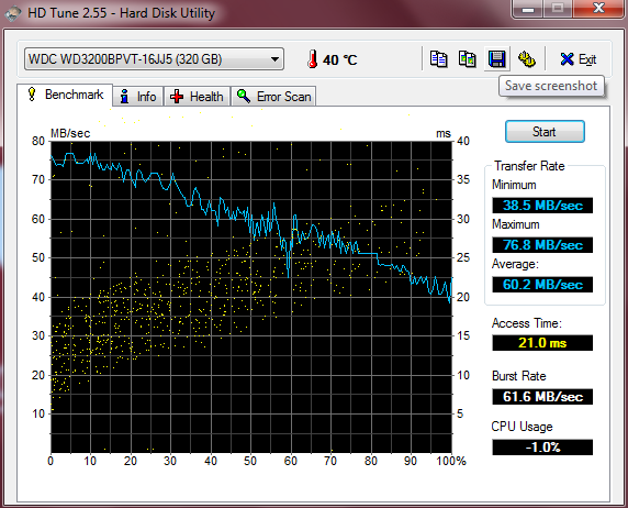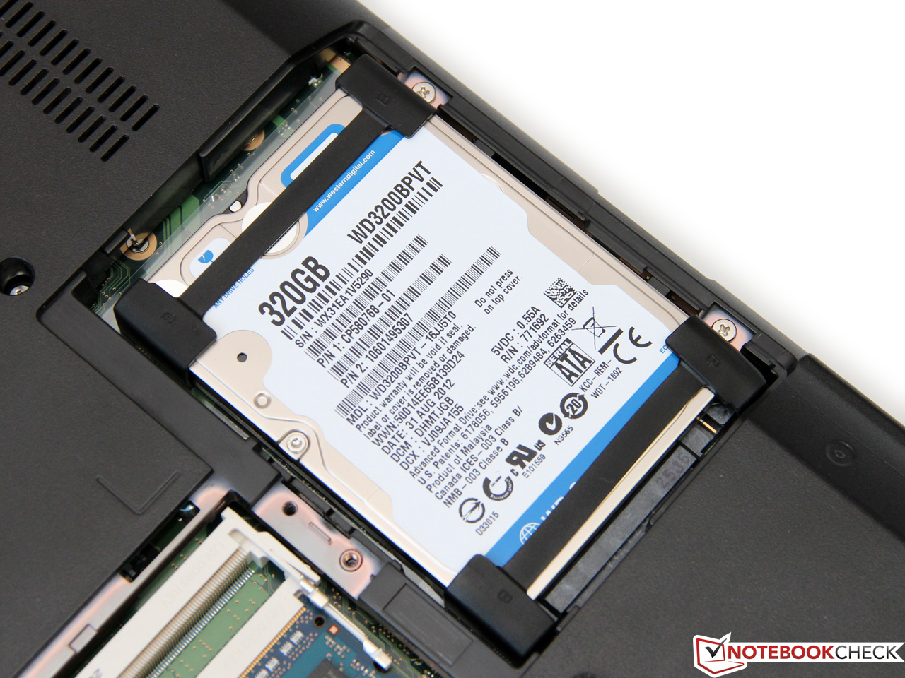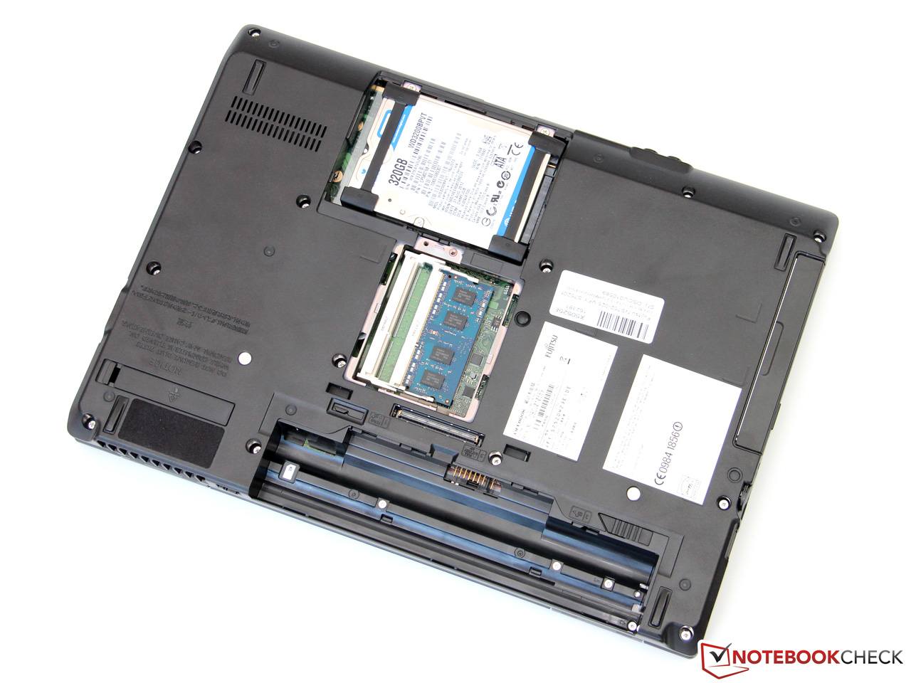 Die 2,5-Zoll-Festplatte mit einer Kapazität von 320 GByte stammt vom Hersteller Western Digital und gehört zur Scorpio-Blue-Serie (WD3200BPVT). Mit einer langsamen Drehzahl von 5.400 U/min sowie der geringen Datendichte erzielt das Laufwerk nur relativ schlechte Transferraten von etwa 60 MB/s beim Lesen und Schreiben. Zum Vergleich: Das etwas teurere ThinkPad L430 mit einer Hitachi Travelstar Z7K500 (500 GByte, 7200 U/min) knackt fast die Marke von 100 MB/s. Auch bei der Zugriffszeit muss das Lifebook seinen Konkurrenten mit 18,4 zu 21 Millisekunden davonziehen lassen.