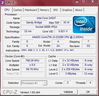 Bei Intels Core i3-2328M handelt es sich um eine Neuauflage des letztjährigen i3-2330M, der allerdings um die Unterstützung der Small Business Advantage Tools beschnitten wurde; damit entfällt beispielsweise das Wireless Display Feature. Von dieser Einschränkung abgesehen gleicht die CPU exakt ihrem Schwestermodell: Zwei Rechenkerne auf Basis der Sandy-Bridge-Architektur, 2,2 GHz Basistakt, Hyper-Threading, aber kein Turbo Boost. Die TDP von 35 Watt entspricht dem üblichen Standard eines Dual-Core-Prozessors.