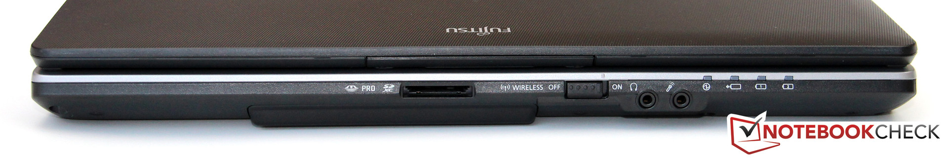 Mit Ausnahme des LAN-Ports (Rückseite), der Audio-Buchsen und des Kartenlesers (SD und MS, Vorderseite) befinden sich alle Anschlüsse an den Gehäuseflanken. Die Positionierung ist Fujitsu recht gut gelungen, nur der geringe Abstand zwischen den USB-Ports kann sich unter Umständen als problematisch erweisen.