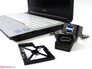 Für den Docking-Anschluss am Unterboden, bietet Fujitsu einen Portreplikator (S26391-F655-L100) an, der im Online-Shop für knapp 130,- Euro erhältlich ist. Dieser erweitert das LIFEBOOK hauptsächlich um Schnittstellen, die man am Notebook selbst nicht findet. Dazu gehören u.a. eine parallele und eine serielle Schnittstelle sowie eSata und DVI. Der Wechselschacht kann anstatt eines optischen Laufwerks ein Leermodul (Gewichtsreduzierung) oder einen Wechselschacht-Akku (siehe Akkulaufzeiten) aufnehmen. Ein Festplattenmodul ist von Fujitsu derzeit nicht vorgesehen, auch bei Zubehörhändlern wie newmodeus sind wir nicht fündig geworden.