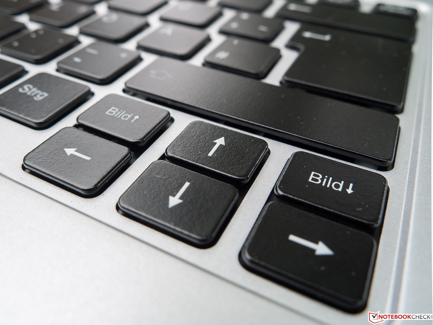 Charakteristisch für das Tippgefühl sind ein kurzer Hub, ein gut spürbarer Druckpunkt sowie ein nur leicht abgefederter Anschlag. Leider machen fast alle Tasten und im Besonderen die großen wie Return und Space beim Tippen deutlich auf sich aufmerksam, was die Verwendung in lärmsensiblen Umgebungen einschränkt. Wie die gesamte Oberseite der Base lässt sich auch das leicht versenkte Tastaturbett mit realistischem Kraftaufwand an keiner Stellte eindrücken. Die zweistufige Tastaturbeleuchtung illuminiert die Tasten gleichmäßig und ausreichend hell.