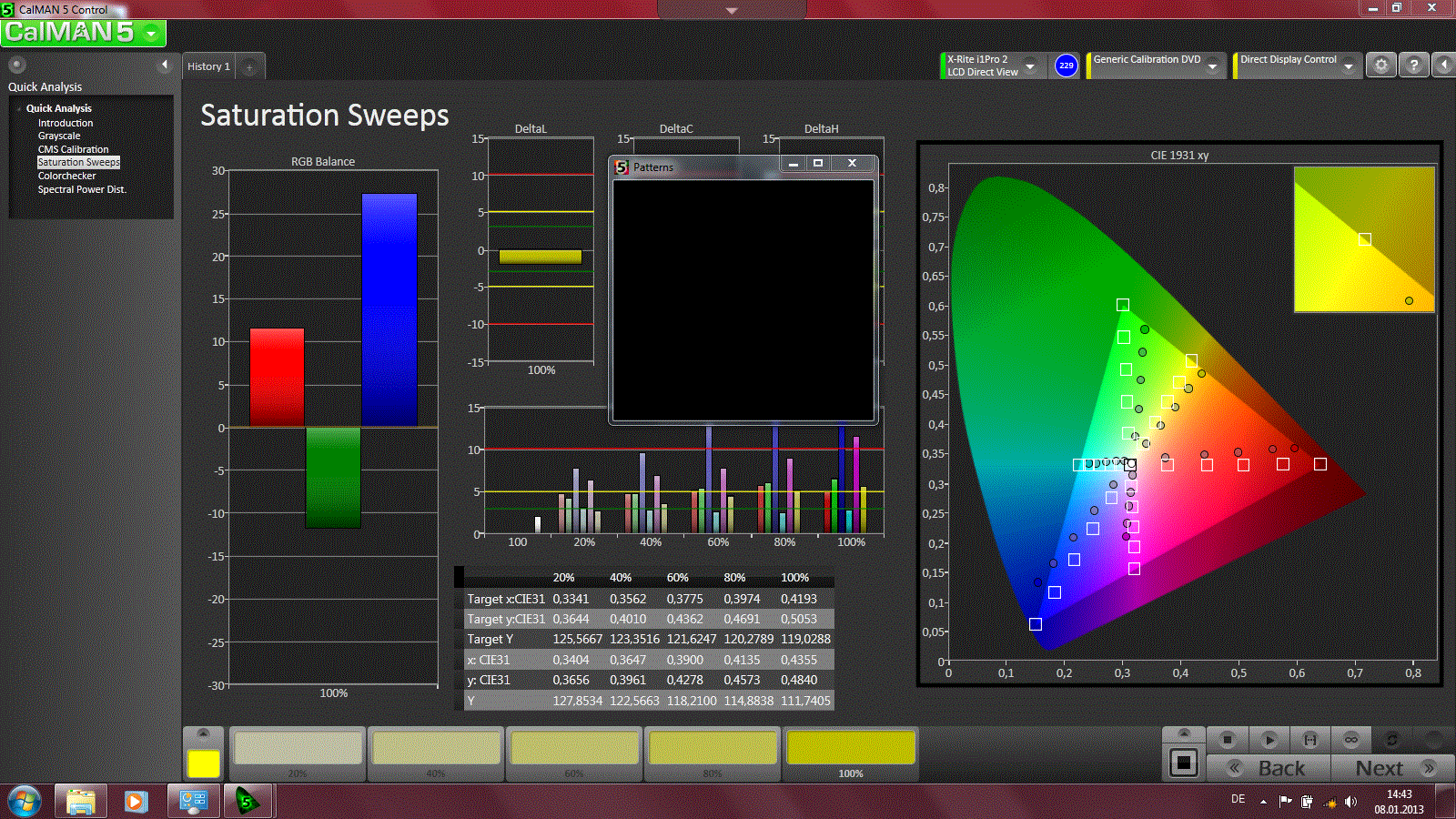 Je nach Helligkeitseinstellung liegt der Gamma-Wert zwischen 1,9 bei 10 Prozent Helligkeit und der Zielvorgabe 2,2 bei maximaler Helligkeit. Ebenfalls helligkeitsabhängig schwankt die Farbtemperatur zwischen 6.140 Kelvin und 6.460 Kelvin und bleibt damit unter dem Ideal von 6.500 Kelvin. Obwohl sich der Weißpunkt ziemlich genau im Zielbereich der CIE 1931 Normfarbtafel befindet, liegen bis auf Cyan alle weiteren Farben absolut gesehen weit außerhalb der Zielvorgabe. Auch die Sättigung entspricht nicht dem Soll und fällt insgesamt zu schwach aus. Weit außerhalb eines DeltaE von 5 bewegen sich hauptsächlich aber nur Blau und Magenta. Diese Blaustichigkeit ist ein Nachteil vieler Displays, die mit White-LEDs ausgestattet sind. Immerhin fällt beim Lifebook T902 dieser Effekt relativ gering aus. Sichtbar werden Abweichungen für das menschliche Auge ab einem DeltaE von 3 und mehr. Dem schon sehr nahe kommen die Graustufen mit einem DeltaE von durchschnittlich 3,45. Im Vergleich zu guten Desktop-Monitoren sind die Ergebnisse nicht gut. Nimmt man als Messlatte jedoch die bisher von uns nach diesem Verfahren getesteten Notebook-Displays zur Hand, so setzt sich das Fujitsu Lifebook T902 zumindest vorübergehend an die Spitze des Testfelds.