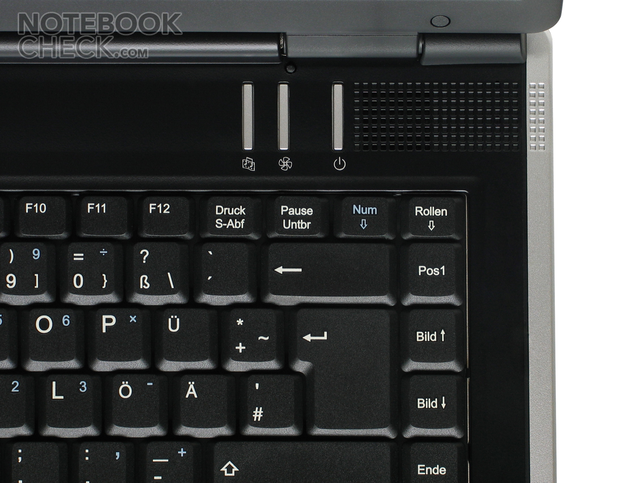 Weniger gut ist auch das Tastenlayout des Notebooks gelungen. Es weicht in einigen Punkten vom Standard ab und erfordert somit eine Eingewöhnung. So liegt die Fn-Taste unnötigerweise ganz links außen und wird somit zwangsläufig oft mit der Strg-Taste verwechselt. Die Einfügen- und Entfernen-Tasten hat der Hersteller von ihrer angestammten Position ganz nach unten neben die Pfeiltasten verbannt. Stattdessen besetzen die Umschalter für den numerischen Ziffernblock und die Rollen-Taste deren gewohnten Platz in der oberen Ecke. Unverständlich, da diese beiden Tasten jetzt zwar günstig liegen, im Alltag jedoch so gut wie nie benötigt werden.