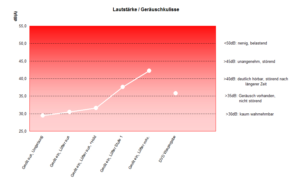 Unter Last erreicht das Amilo Pro eine maximale Lautstärke von 42.2 dB. Die Lautstärke bei DVD Wiedergabe bleibt mit gemessenen 35.8 dB durchwegs im grünen Bereich.