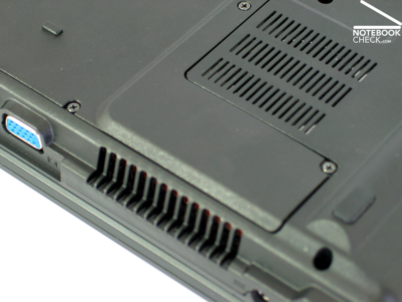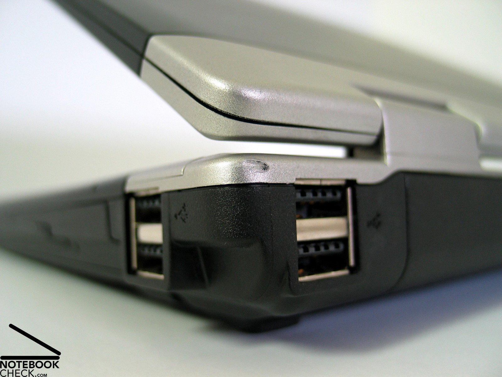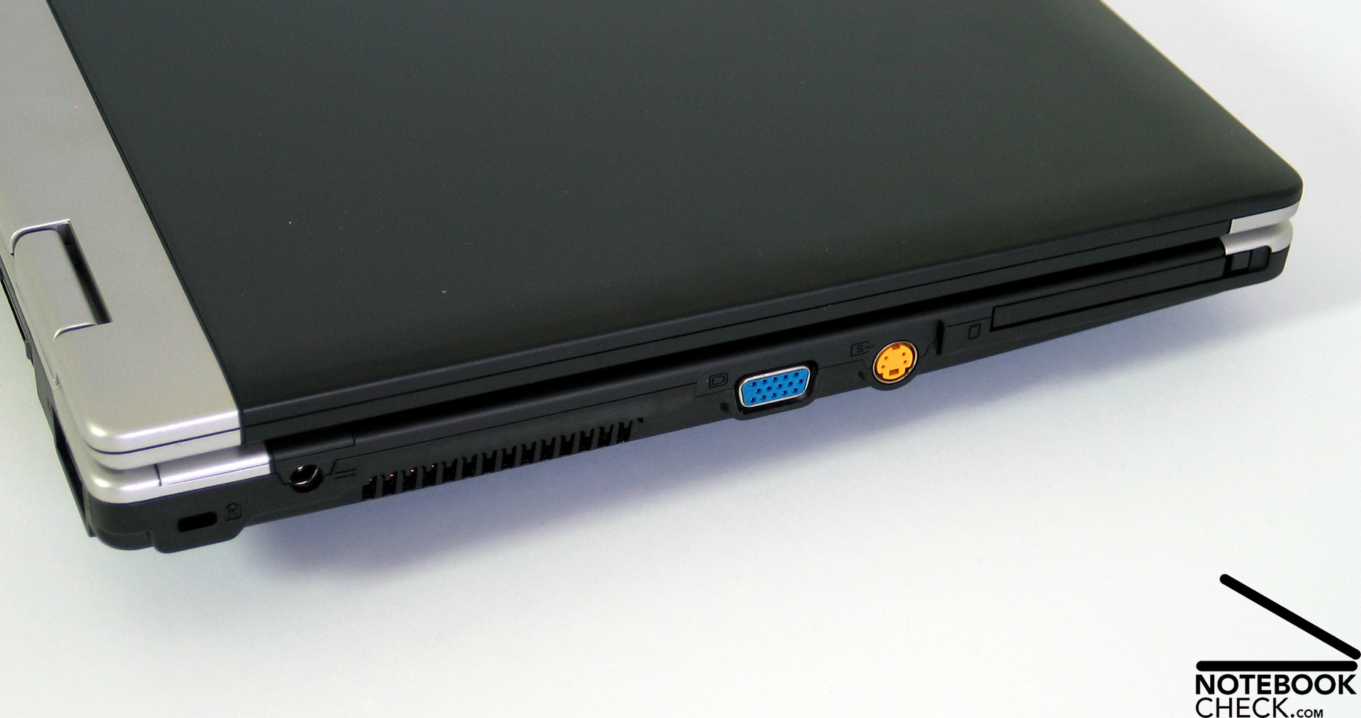 An der Vorderseite findet man den Fast IrDa 1.1 Port mit einer Übertragungsrate von bis zu 4 Mbits, einen 3in1 Cardreader und die beiden Audio Ports (Mikrofon, Kopfhörer). An der linken Seite findet man dann in der Reihenfolge von Vorne nach Hinten: Einen PCCard Slot (Typ I und II), S-Video und VGA Ausgang, die Lüfterausströmöffnung, den Netzanschluss und ganz Hinten ein Kensington Schloss.