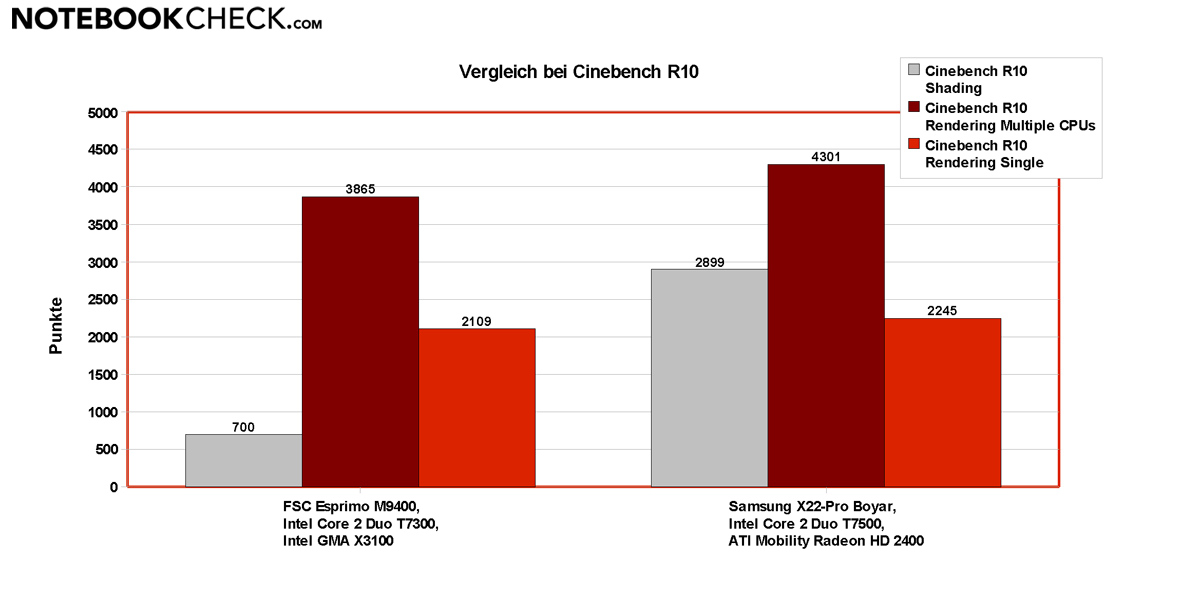 An der Gesamtleistung gibt es beim Esprimo Mobile M9400 dank Intels Core 2 Duo T7300 mit 2,00 GHz Taktfrequenz je Kern und zwei flotten DDRII-667-Speicherriegeln (PC2-5300) mit einer Gesamtkapazität von 2.048 MByte für das installierte Betriebssystem Windows Vista Business nicht wirklich etwas zu meckern. Für übliche Büroarbeiten und Office-Anwendungen offeriert das Esprimo stets genug Dampf. So erreicht das Business-Notebook im PCMark05 auch mit 4.107 Punkten einen hohen Leistungswert. Dafür verhagelt die integrierte Chipsatz-Grafik dem M9400 beim Vista-Leistungsindex mit einer Gesamtbewertung von 3,5 ein noch besseres Ergebnis.
