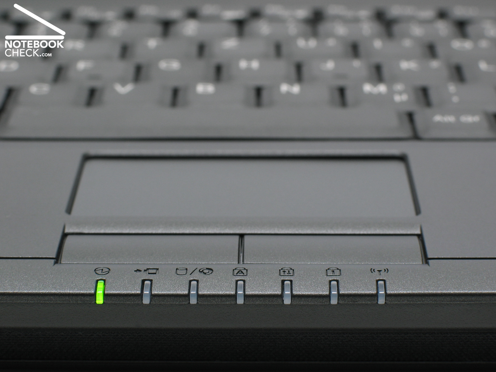 Die Status-LEDs für Akkuladung, Funkkomponenten, Massenspeicheraktivität und Tastatur sind mittig an der vorderen Kante vor dem Touchpad platziert und lassen sich daher auch beim Schreiben kommod ablesen. Eine Schnellzugriffstaste neben dem Netzschalter erlaubt das bequeme und schnelle An- und Abschalten aller drahtlosen Kommunikationsmodule wie Bluetooth, UMTS/HSDPA und Wireless LAN. Weitere Zusatztasten zur schnellen und kommoden Bedienung verschiedener Systemfunktionen bietet das Esprimo Mobile M9400 hingegen nicht an.